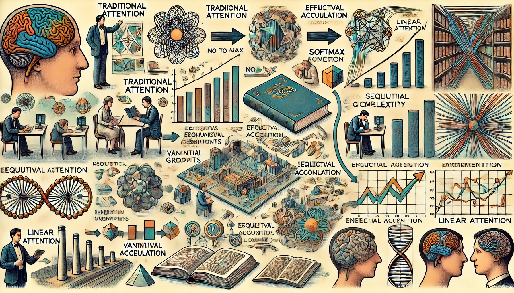 一个有趣的类比是 线性注意力与人类记忆机制 的相似性。传统注意力机制会扫描所有过去的记忆以找到相关信息(就像重读整本书来找到一句格言来引用),而线性注意力则是在获取新信息时逐步累积上下文(就像在阅读过程中做简明的摘要笔记)。这种累积机制使线性注意力能够高效地保留上下文信息,而无需反复回顾之前的输入。