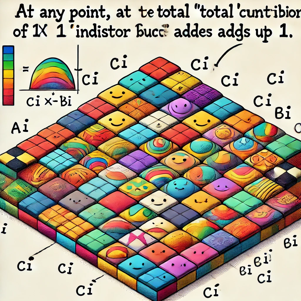 现在再想象一种情况:你曾经有一张大地毯,现在打算用一组柔软的“小地毯”或“小垫子”完美的替换它,每个小垫子覆盖一定区域,但它们的边缘会有一些重叠。为了让地毯看起来整洁一致,我们可以调整每个小垫子的“厚度”或“贡献值”,确保无论你站在哪个位置,所有重叠部分加起来的高度正好是一样的(比如总高度为 1)。这种方法就是利用平滑的 bump 函数,通过恰当归一化,让它们在重叠区域内加起来的总和恒定为 1,也就是构成了一个分割单位。大地毯等价于很多小毯子叠加。